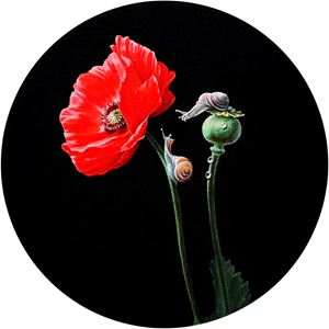 A hand-carved alabaster sphere, resemblinga fossilized planet, symbolizes the disappearance of life.